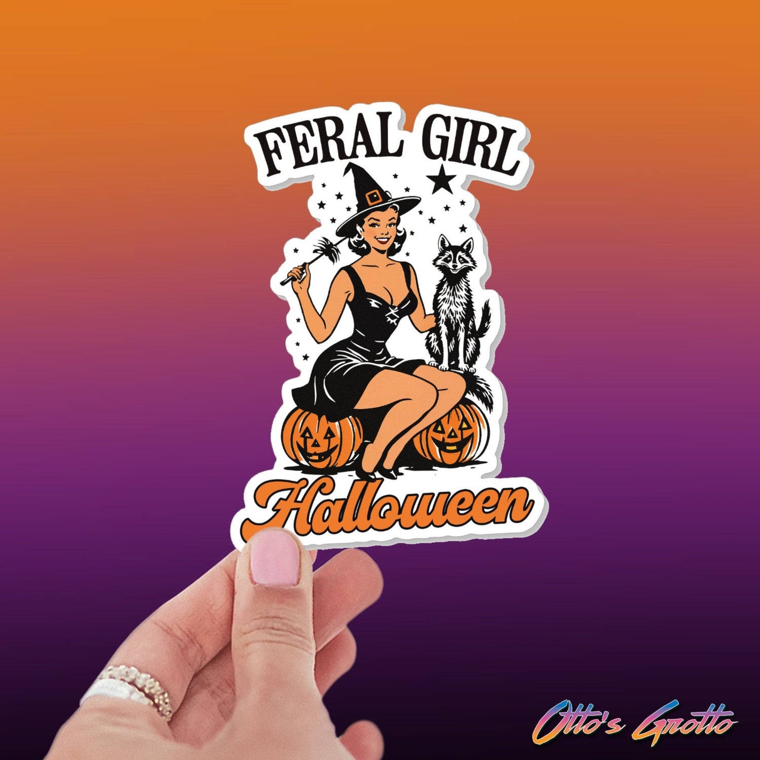 Feral Girl Halloween Sticker | Retro Witch & Raccoon Sticker | Cute Halloween Sticker | Vintage-Inspired Spooky Sticker | Witchy